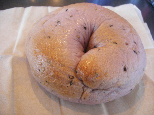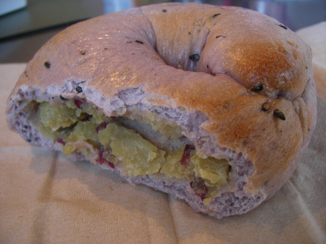 わりと定期的に買いに行ってるのは地のりからいうと「ベーグルカンパニー」かもしれません。ここの「ベーグル」のお味が好きです。 最近ずーっといってなくてそろそろ恋しくなってきてるベーグルをお友達にいただきました。 十条のnoroベーグルです。 生地は相変わらずむっちむちでしかもねっちょりなんだけど、でもここのは歯にはくっつかない。不思議なんだけど。ああ、この前のBagle holicのベーグルはここのに似ていますね。でも、あそこのは歯にくっつくのよねー。 で、これさつまいもあんがたくさん入ってます。 で、これが甘すぎずかなり美味しいです! カットするとたくさん入ってる。 そしてもちろんもっつもちで。 noroさん前より絶対大きくなってます。 これはお店に行かなくちゃ。