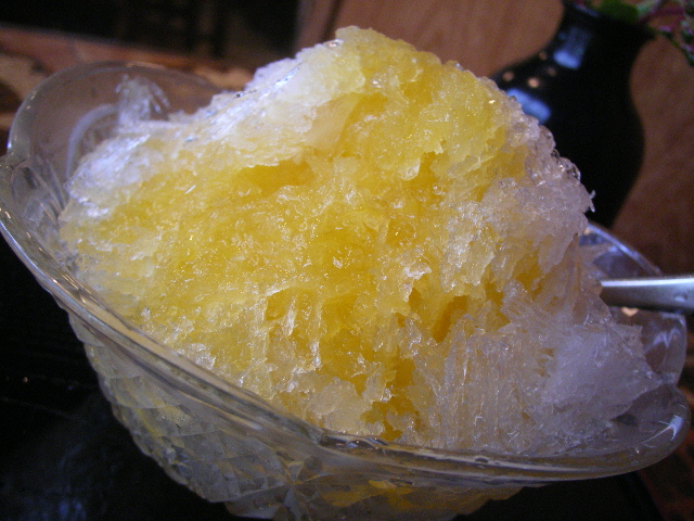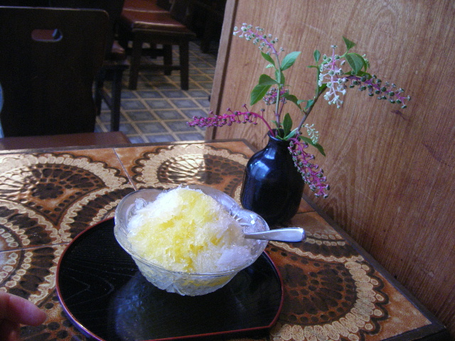 あんみつやらおしるこやらもちろん和菓子はいただいてますが、氷は初めて。 マンゴーは生のオリジナルソースだというのでいただいて見ました。 ここの喫茶室、落ち着くんで、実はかなり好き。 すいていて、いいのだけど、なくなっちゃわないかどうか心配な御店のひとつです。 何せ、注文入れるとゆっくりゆっくりおじいちゃんが作ってくれるんです。 跡継ぎさんはいるのかしら?とか余計な心配してしまう。 しむらとかを見慣れると、とても普通なシンプルな大きさと姿の氷。 マンゴーピュレは甘めです。 こおりが優しい感じでなく、男前のトゲトゲした感じだったので、あいにくワタシの好みではありませんでしたが、氷としてはお安いと思うし、ここでのたゆたう時間を楽しむなら、これはこれでありかと。 でも、この次は白玉あんみつ頼もうっと。セットで。(笑)