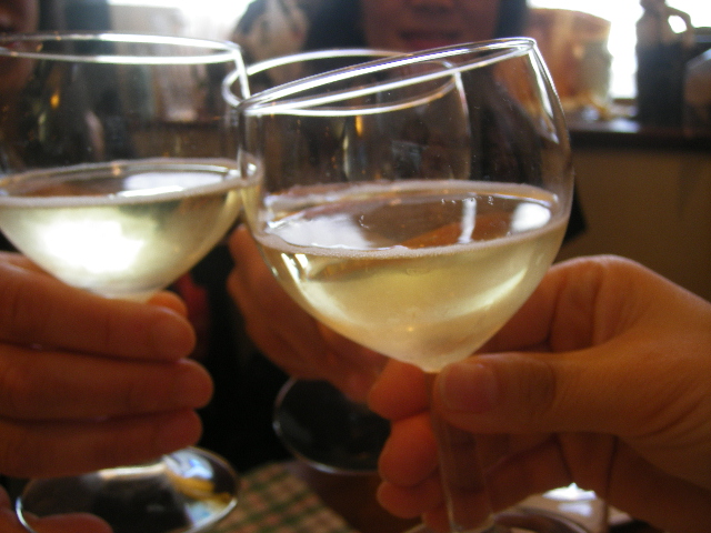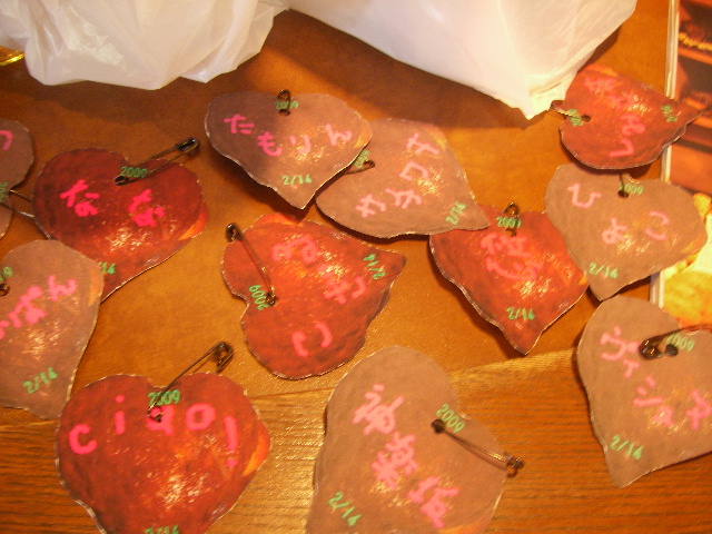 02/14/23:19 kenパンでバレンタイン @赤塚今回はバレンタインデイに開催。 したがって、恒例の名札もバレンタイン仕様。 一人じゃこんなにたくさんの種類はいただけませんからね。 これだけ種類あるとどきどきわくわく。 乾杯は、スパークリングワイン。その後にネタものワイン、「女王の微笑み」 ・・・・ グラタン、パスタ、サラダにペンネ。 満腹、そして大満足。 そして参加の皆様の持ち寄りおっみやの数々がうれしい。 マスターからの逆チョコまであったりして。 おまけが、手作りのスイートポテト。 中に1個だけ芥子が入ってる・・・、なーんてことはなく? こちらが当たり☆ あたりの賞品はチョコレートでした。 初めての方も、知り合いの方も皆さん和気藹々と、大変楽しい、そしてもちろん美味しい会でしたよ♪ ごちそうさまでした~。
