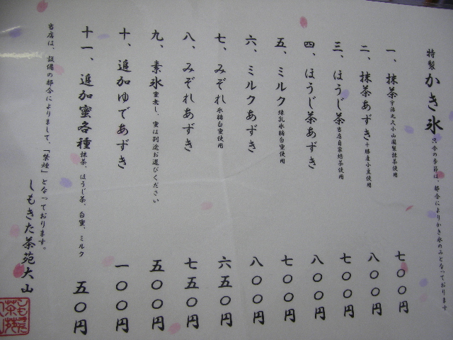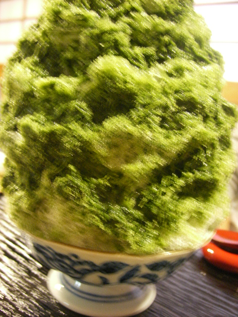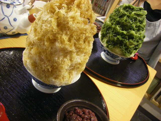 (カレーランチは後でレポ。) 土曜日の午後におじゃました、下北沢の「しもきた茶苑大山」さん。 2階に喫茶室があります。 あらまあ、タイ料理のバーンキラオの奥だったんだ、気づかなかったですよ。 さすがお茶屋さんだけあり、お茶の氷ばかりです。 何にしようかさんざん迷って、 アズキは別添えでお願いできるというので。 ほどなく氷が来ますが、どどーんと迫力!! おー、確かにほうじ茶の香りですわー。おもしろーい。 これをあわせて食べるもよし、別々に食べるのもよし。 だから、あずきとのコントラストがはっきりしていいのかも。 これは、あずきなしの氷よりも絶対アズキをつけた方が美味しくいただけることうけあいです!! 友達の抹茶。 抹茶がすごく濃い。抹茶好きな人にはたまらんかも。 そして、時間を追うにしたがって、抹茶の色が氷に浸透していくのか、薄くなるんです。 おもしろいなー。 こちらの御店、入店時に並んでいたので、そこそこ待ちましたが、 待っている間にミント風味のほうじ冷茶をだしていただきました。 さっぱりしていてそして、とても深い味わい。 こういうサービスはうれしいですね。 1階の店主さんもご親切だし、又リピートしたいな。