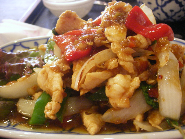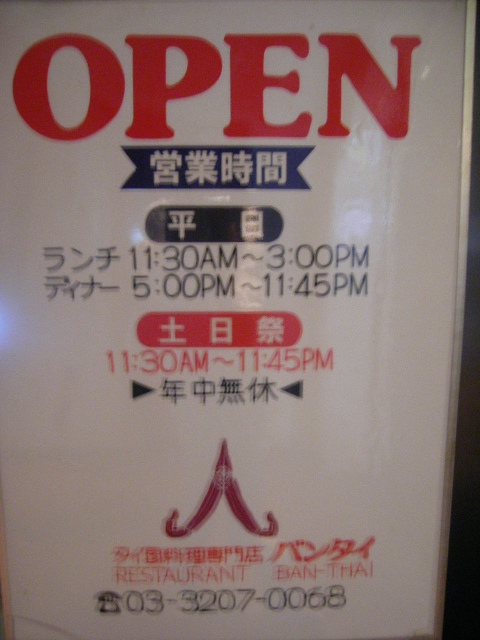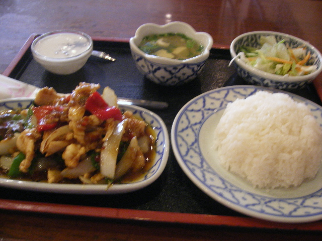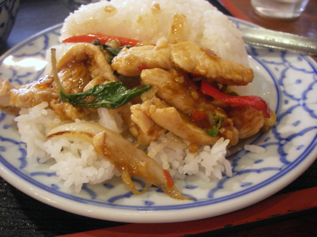 07/30/01:19 ホーリーバジルに魅せられて @新宿歌舞伎町歌舞伎町です。 この前歌舞伎町でカラオケしたとき、勘違いしてみつけられなかった、タイ料理のお店「バンタイ」に突入しました。 又迷っちゃった。 でか、ここかいー!!ってところです。 もっと若かりし頃だったら、きっとここ一人で入れなかったなあ。 なんて重厚なドア。 そしていかにもBarだもんね。 ここはさすがに女性一人ランチはほとんどいませんでしたね。 ちと驚いたのが、こういうお店にはこなそうなオバサマお二人連れがいたこと。(きっと私とそう歳変わんないと思うんだけどね。笑)オバサマたちは観劇後、なのかもしくはチケットゲットにいらしたのか、そんな感じでした。残念ながら何注文されてたのかはわかりません。 さて、どうしてこのような場所に訪れたか、というと、もうガッパオが食べたくって食べたくって。 で、ここのはかな~り本格的でうまいし、ちゃんとホーリーバジル(ガッパオ)が入っている、というので。 そうそう、ルミネのゲウチャイのガッパオはおいしいけど、ほんの少ししかガッパオが入ってなかったなあ。 平日なのでランチがあるようだったので、それにしてみました。 初めてのお店が緊張するのか、フライドエッグをつけてもらうのを忘れちゃった。。。 ランチはこんな感じ。 サラダにスープにデザートがついてます。 これ、いらないなあ、と最初思ったけど後であってよかったと思いました。 なぜならね、このガパオごはん、すご~く辛かったの!! インドカレーの辛さには慣れてるつもりだったけど、これは辛かった!! 本気でまずい、腹壊す~、もしかして、残しちゃうかな?と思ったんですが・・・ 怖いですねえ、鳴れって。確かに辛いですが、最近のスパイスまみれが効いてるんだか、途中から鳴れました。(笑) サラダのドレッシングは辛かったけど、スープは辛くなくってお吸い物のような感じなんで、間に飲んで緩和させ、お水は大きいグラスに丸々2杯で乗り切りました。 わゆる鶏肉のバジル炒め、てのががパオですが、よくあるのは挽肉ですが、これは切り身ですね。 たたいてある鶏肉の場合もあるようです。 で、それに赤、緑のペッパーとかがからんでます。 まあ辛いわけやね。 バジル炒め、っていってもよくあるスイートバジルでなくホーリーバジルです。 これはなかなか日本では入手困難なようで、フレッシュなものはなかなか手に入らないようですね。レストランとかでは冷凍ものを使っているところも多いと聞きます。 バジルの見えてるところらへん。 バジルの量はしっかり入ってますよ。 まだあまりガッパオは色んなお店でいただいてないので、比較が難しいですが、こちらのはほんとに美味しいと思いました。 ただ私の好みだともうちょっと辛くなくてもいいんだけど。 でも、きっとこの辛さがタイではデフォルトなんじゃないでしょうか。 すっごい辛いけど、又食べてみたいです。 ああ、タイ料理も美味しいよね♪
