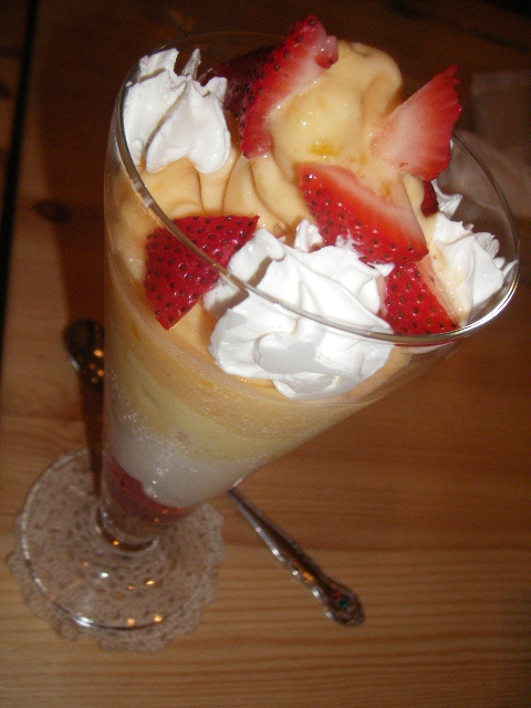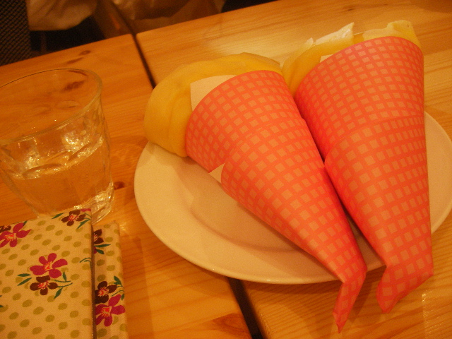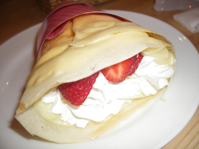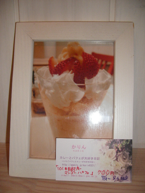 夜の訪問は初めてです。 先週、さっさと伺って食べたいと思いつつもおなかの具合と多忙につき行けませんでした。 そんなワタクシに、渡りに船のお誘いが。 かりんさんご本人からの、かりんパフェ101本目記念の会パート2へのお誘いが。 はい、仕事からさっさと帰宅して、家族の夕食用意してから出かけましたよ、これでも一応主婦でございますので。(ええこの日の家人の夕食は秋刀魚の塩焼きです。やせているが味がよさそうな秋刀魚です。他は、サラダに煮物。えーい、文句はあるまい!) しかも、トライアングルでなければいけない。(笑) こちらのお店のパフェグラスは5本。 したがって、一度に用意できるのは5個までです。 この日のメンバーは全部で9人。 まずは5個のパフェにクレープを注文。 皆して5個並んだパフェをまとめて写真に撮りたいが為、5個そろうのを待っています。(さっさと食べないで) そして来ました!!5パフェです!! これで700円です!! マンゴーソフトは果肉がプチプチ。 元々こちらのカスタードと生クリームがおいしいのはわかっていましたが、この組み合わせは罪な組み合わせですねえ。 ずらずら書いてみると、とっても甘そうな組み合わせのはずなのに、それぞれが甘すぎずにそれぞれの素材のお味をひきたててます。 ヨーグルトと苺ソースが最後は絡み合って、後味もグー!! 今回一緒したブラックホール秘書と一緒に、このパフェと、クレープをシェアしました。 ここに来るとどうしてもクレープも食べたくなってしまって・・・。 いつもついついバナナキャラメルとか頼んでしまうので、苺系はランチのデザート以外は未食です。 これは、かりんさんお奨めの苺カスタード生クリーム。 相変わらず皮はもちもちしていておいしいし、この組み合わせも素敵☆ うーん、これも美味しそう。魅かれますね~。 次回何を食べようか迷ってしまいます。 どどーんと手に持つと重たいんですよね。 ずしっ、ですよ、ずしっ。 これで450円でいいんですか? 同じ450円で原宿だったらきっとカルっ、ですよ、カルっ。 そしていつもお店にいるとは限りませんが、このような方もこちらのお店にはいらっしゃって、私たちを癒してくれます。 うー、かわええ~。 クレープShop & Gallery CAFE