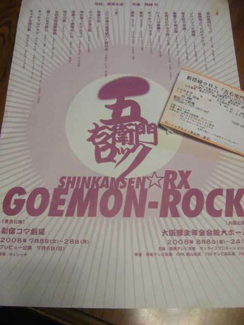 07/17/22:42 たまには舞台も止まらない~☆歌謡ショーとか多いよね。北島三郎ショーとかさ。 なんの因果か石川五右衛門の怨念か(うそ)、劇団新感線がここで上演。 おりしも、劇場の寿命も相当なものなので、近くリニューアル(?なのか?)の予定で、この演目を最後に取り壊されるらしい。 で、平日の夜にコマ劇場、潜入。 「五右衛門ロック」でございます。 てわけで、実は来週マチネも観にいく予定なので、 感想はその時に。 だって、一回じゃ元ネタがわからんのよ。今回のおばかねた多すぎて!! スタッフ 作:中島かずき 演出:いのうえひでのり 音楽:岡崎司 衣装:小峰リリー 振付:川崎悦子 小道具:高橋岳蔵 音楽部:右近健一 キャスト 石川五右衛門:古田新太 真砂のお竜:松雪泰子 岩倉左門字:江口洋介 ペドロ・モッカ:川平慈英 シュザク婦人:濱田マリ ボノー将軍:橋本じゅん インガ:高田聖子 ガモー将軍:粟根まこと クガイ:北大路欣也 アビラ・リマーニャ:右近健一 一応全席ソルドアウトらしいです。 当日券開場30分前から30枚くらい?出るそうです。 これね、おもしろいよ!! (でも、歌は下手。) PR