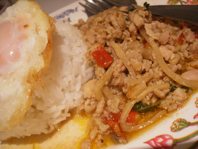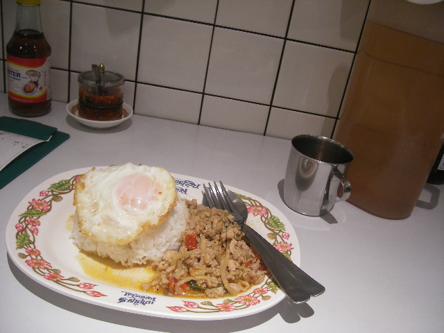 06/29/22:18 ガッパオ @新宿雨も降ってて時間もなかったけど、ガッパオが食べたい!! てんで、新宿南口のルミネパート2の地下、「ゲウチャイ」に。 ランチメニューでなく、ガッパオを揚げ卵つきで850円。 1人だったので、カウンターでしたが、ここだと壁にアルミカップが下げてあり、お茶を自分でつけるようになってるのね。 ところで、これガッパオ(ホーリーバジル)の量が眼一杯少ないのね。 某カレーブロガーさんの検証どおりでした。 美味しいのにもったいないなあ。 ここのパッタイは結構好きです。 それにしても、日曜の昼前、ゲウチャイ結構混んでました。 まあタイ料理が普通に流行るのはうれしいことです。