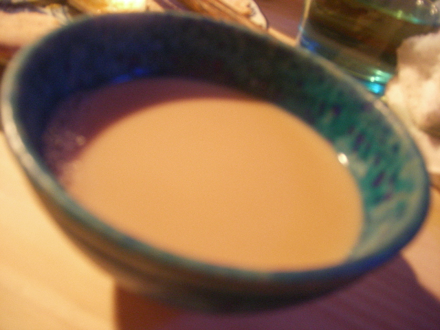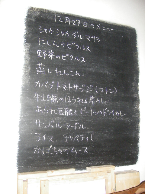 さて、コチン・ニヴァースは今年はわりと早じまいだし、と、 年末の疲れた胃に優しい、もうこれはTapirしかない!! しかし、関西のお友達が会いたい、と言う人を全部呼んで、Tapirさんに入るか?! てんで、思い切って店主さまに相談。 「大丈夫です」というありがたいお言葉に即決定で、希望料理は告げた上で後はおまかせでお願いしました。 すると、にしんとか牡蠣はどうでしょう?と店主さま。 興味津々です。 ともあれ、関西のお友達のセレクトによる、おもしろおかしい芸人カレー・パン好きメンバーでの 「西から来た人とカレーを食べよう会」(裏名まえは、「ダス兵衛の夜」) ・・・・わけわかんない名称ですが。 ←こちらが、その日のお品書き。 不思議な 手前が辛口、奥が普通。と2種類用意していただきました。 にんにくのペーストがれんこんの穴に詰まってます!! ビールが(ハートランド)進む~。 さっぱり。いい箸休めです。 羊ですよ~。 羊好きなメンバーが揃ってますから、羊メニューを1品、と お願いしてあったのだけど、 カバブのカレーだとは! かなり辛くておいしいいいい~~~~っ。 チャパティです。 もちろん、店主さんの手作りですよ。 奥の折りたたんであるチャパティの中には洋梨のフィリングが入っています。 ちょっとデザートちっく。 光っちゃってますが、もっと緑です。 はい、サグカレーです。牡蠣入りです。 牡蠣がぷりぷりですっ!! うんまいです~。 サフランライスはおかわりOK。 美味しいカレーでごはんも進みます! 悶絶です!!! 取り分けると、もっちもちの手打ち麺のおいしそうなのがわかりますねー。 これは、〆にぴったり。 豆乳チャイ いつも優しい味の豆乳チャイ。 Tapirさんの冬メニューの代表格とでも言えますね。 かぼちゃのムース、バナナクリーム(カルダモン入り)添えです。 きゃーーーーっ!! てなわけで、Tapirさんの夜はふけて・・・。 大満足の夜でした。 美味しいお料理に、素敵なメンバー、そして大笑いのいい夜でした。 友達も満足してくれたと思います。 2008年いいカレーの〆が出来たよね!! 今年もカレーにあけくれて、ついにカレーだけのブログも初めてしまいました。 世の中、色々なことがあるけれど、 明日をも知れない命だったはずの、猫姫も頑張って闘病してくれてるし、 本当にいい年だったと思います。 来年もいい意味で好奇心溢れ、ポジティブに行動していきたいな。 皆様もよいお年をお迎えください。