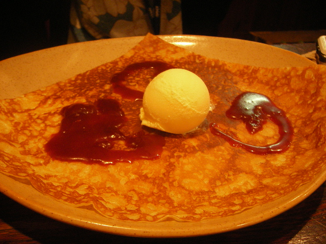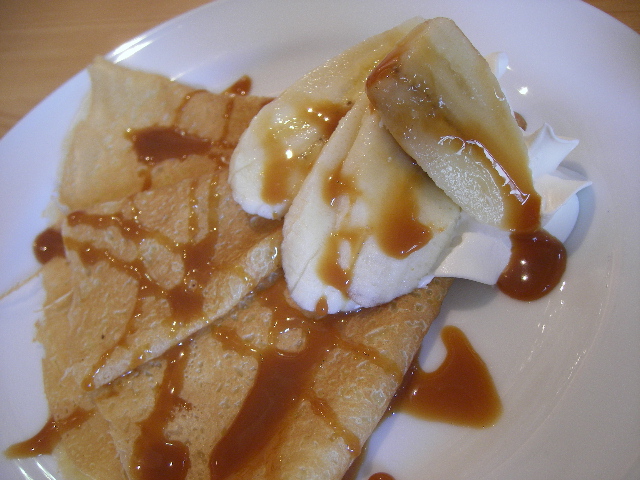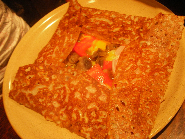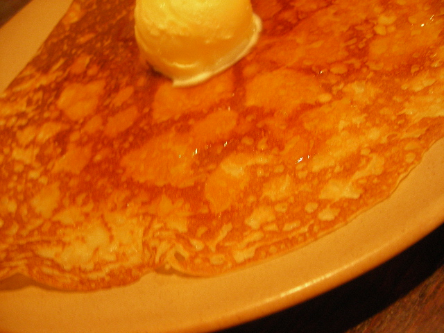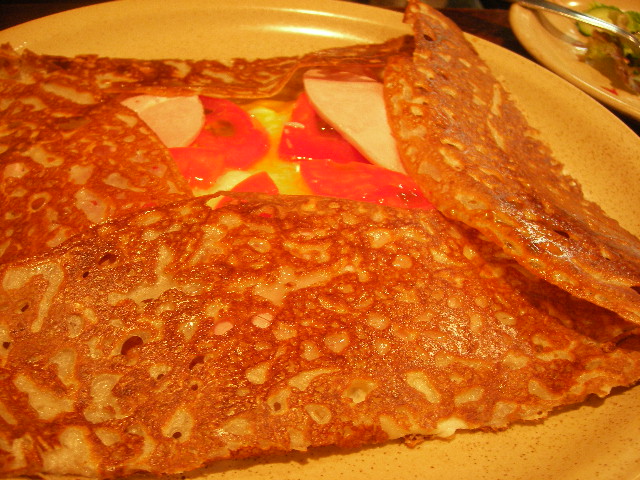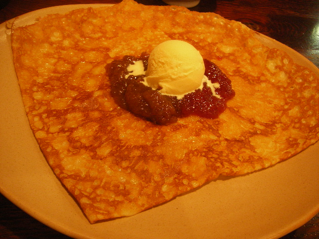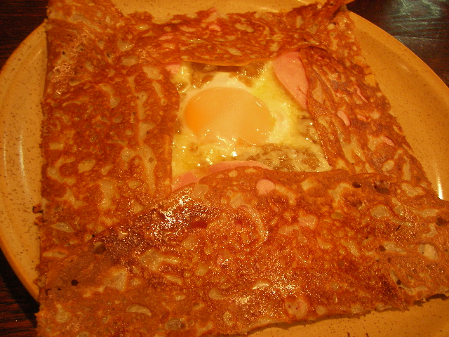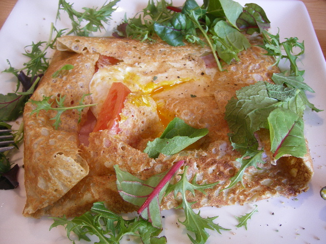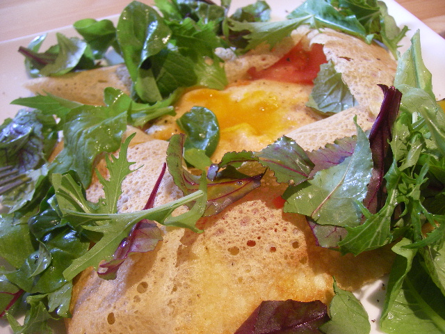 今度はムスメっちと行きましたよ。 (ムスメっちの好きそうなパリとか東欧のテイストの店内なので。) たぶんそば粉のガレットだと思います。 先日食べたガレット屋さんにも全然負けてないクオリティです! ランチを頼んだら、全部のせでいいですか?とおねえさん。 卵にハムにトマトかな?ランチでないと700円のようですが、それでお願いしました。 するとこんな素敵なガレットが。 これは卵にナイフを入れたところです。(モチロン!!) このガレットにドリンク(私、珈琲、ムスメっちはグレフルで。)とデザートクレープがつきます。(800円て安い!!) このクレープもそうですが、ガレットもとてもモチモチしててとても生地がおいしいんです♪ で、他のものにもとても気を使っているようで、グリーンも卵もハムもバナナも生クリームもすべてが美味しい。 こういう良心的なお店は混むのはいやだけど、流行って欲しいですねー。 今度はクレープをしっかり食べてみたいな。 ちなみにこの日のらんちはカレーとラタトゥイユが売り切れで、ハッシュド・ビーフがありました。 それも気になりますね。ここのなら美味しそう!!