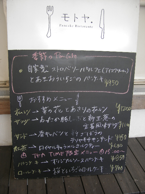 ぎりぎりまで行けるかどうかわからなかったんですが、無事デビューできました! モトヤ パンケーキリストランテ 実は初めての来店なのです。 お友達のおかげで行くことが出来ました。 あたたかい日だったので、テラスに座席をお願いしました。 気持ちのいい日差しの中、迷うはメニュー。 しかし、そこでもモトヤのプロのお友達のアドバイスのおかげで、お食事パンケーキのパンケーキは3枚なので、2セット頼み、3人なので2枚づつでオムレツをシェア。 スイーツ系を1セット頼む。 素晴らしいアイデアです!! てなわけで頼んだのは、食べてみたかったチーズオムレツと、その日の日替わりだった、菜の花とアサリのオムレツ。